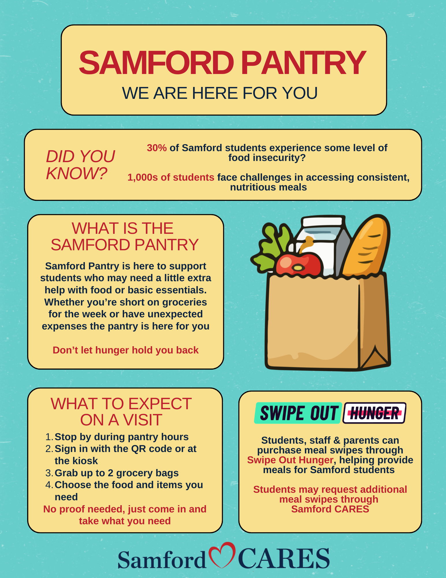 - Stop by during pantry hours: Outside of Samford CARES in the Beard Health & Wellness Center