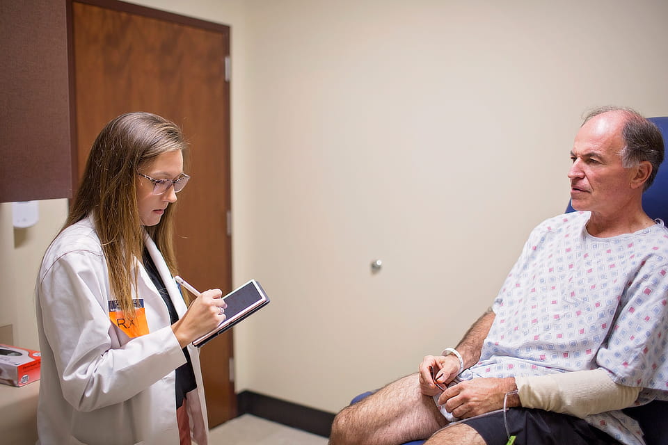 In our standardized patient exam suite, which consists of 10 individual rooms, students are able to practice patient counseling skills with our standardized patients, or professionals trained to act out symptoms and reactions. Students are able to enter the room, introduce themselves as the pharmacist, and begin counseling the patient on a new prescription or reviewing their list of current medications.
