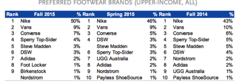 The most impressive part about this study is the fact that Nike dominates both high and average income levels. This really shows the broad target market that Nike has. It also means that they have done a tremendous job with their pricing decisions. Some would say that Nike is too expensive… well this study shows that your average income teenagers apparently don’t believe so. It also could depict that teenagers with the average level income simply place a higher value on Nike apparel and are willing to pay a little more for them. Similarly, people with higher level of income would rather purchase Nike over higher-level income stores such as Vineyard Vines or Ralph Lauren. Nike has done a tremendous job capturing the hearts of all teenagers no matter what level of income they come from.