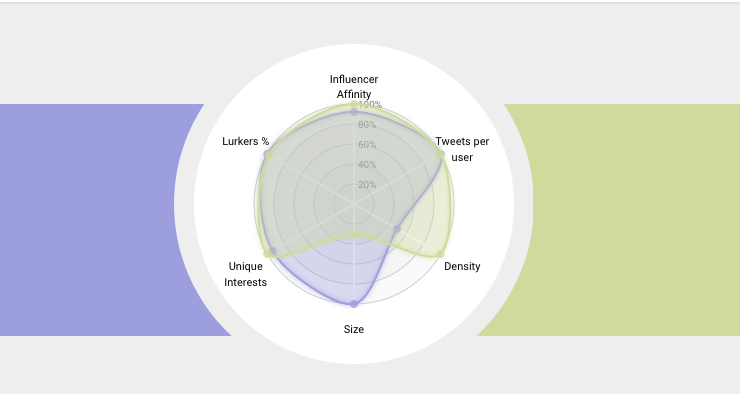 The below graphic demonstrates how much Alabama and Auburn fans hold in common. When it comes to the content they read, like, watch and consume, they share much more in common than one might expect. Note the amount of overlap between the two fan bases in the comparison metric below (the area shaded both purple and green). Outside of college football, our analysis reveals the two fan bases are highly similar on every other cultural indicator.