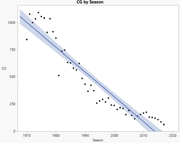 Total Batters Faced per game by starting pitchers has taken a slow, but certainly steady decline for nearly 50 years and is shown in the graphic below to the left with the red trend line. The peak here is at 30.4 TBF/GS in 1973 and comes all the way down to 23.6 TBF/GS in 2017. The next graphic with the blue trend line shows complete games by season. Letting pitchers get deep into games was a lot more prevalent in past seasons with a similar trend line to the previous graph. The steady decline in both shows that managers are taking the ball from starters a lot earlier and a lot more often.