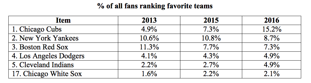 Chicago has the most loyal fans of every professional sport there is in America. Through the top five sports in the United States, Chicago finds itself at the top of the list at number one for almost every category. Baseball is a big exception for the rating though since they have two professional baseball teams; however, one of their teams sits at number 1 in the rankings for favorite professional teams. Through MLB, NHL, NFL, NBA, and MLS the city of Chicago stands firm at the most favorite team in three of those professional sports (Sports Business Resources).