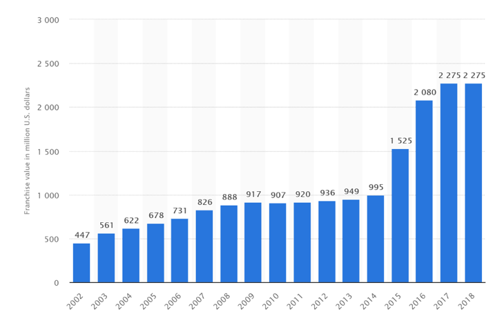Another NFL team that has moved to Los Angeles recently from another city is the San Diego Chargers. Established in 1960 (in LA), the San Diego Chargers had their first inaugural season in 1961. After having fifty-six seasons in San Diego, the Chargers moved to Los Angeles in 2017. According to Fox Sports, the Chargers main reason for ditching San Diego was needing a new stadium that is not outdated. Problems with having an outdated stadium included having a culture where sometimes the opposition team would have more fans than the home team, being the Chargers. The Chargers are now occupying LA Galaxy’s 27,000 seat stadium but will share a brand-new facility with the Rams starting in either in 2019 or 2020. This could be the opportunity that the Chargers need to rebrand themselves into a crowd favorite. However, so far it hasn’t been easy for the Los Angeles Chargers. The move has been anything but easy for the management behind the Chargers. According to The Big Lead, the Chargers have been “nothing short of an embarrassment for the NFL and continue to fail spectacularly in Los Angeles.” Not only that, but the San Diego fanbase abandoned the Chargers once moving to LA; also, the Chargers have failed to gain attention in the competitive race with the Rams. As can be seen in the above graph, the franchise value has stayed stagnant over the past year; the year that the Chargers moved to Los Angeles.