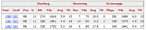 Walker played at the University of Georgia from 1980-1982. During that three-year span, he won the Heisman, a national championship, and nine other honors. The below chart shows his college stats.
