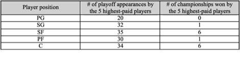 Between the 1999-2000 and 2008-09 seasons, the highest-paid small forwards and centers were arguably most worthy of their enormous salaries because they had the greatest number of playoff appearances and championship victories. Specifically, 35 of the highest-paid small forwards and 34 of the highest-paid centers played in the postseason, and 6 of the small forwards and centers went on to win NBA titles. This is somewhat unsurprising given how dependent teams used to be on their small forwards and centers, who could score from in and around the paint in spite of the formidable defenses they faced. But the game has evolved over the last decade, and the importance of the different positions has changed. With the NBA undergoing a 3-point revolution and today’s scheme of professional basketball being much more spread out, power forwards, point guards, and small forwards have become the most valuable players. This truth is demonstrated in Table B, which reveals that 37 of the highest-paid power forwards, 36 of the highest-paid point guards, and 33 of the highest-paid small forwards made it to the playoffs. Furthermore, 5 of the power forwards, 3 of the point guards, and 4 of the small forwards won the league championship. This means that general managers looking to win an NBA title in today’s day and age should invest their money in power forwards, point guards, and small forwards rather than shooting guards and centers, who make a similar number of playoff appearances but win championships less often.