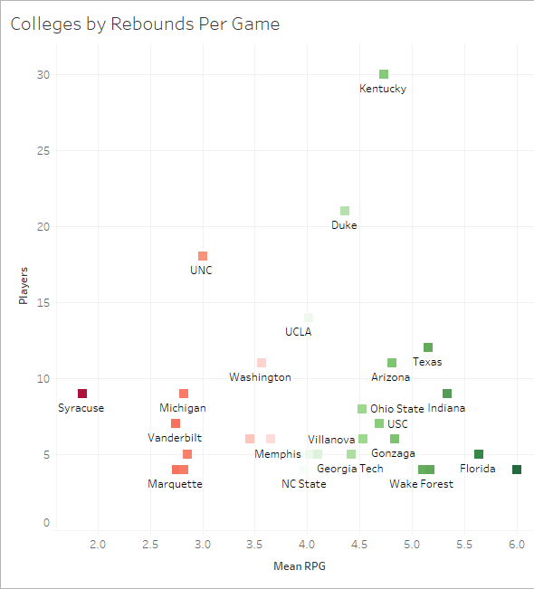Many of the blue bloods of the game did not perform well. While UCLA and Kentucky have sent many strong players to the NBA via first-round picks, others, such as Duke and UNC, were middle of the pack. Still others performed poorly, such as Michigan State and Syracuse, arguably the worst school in the study overall.