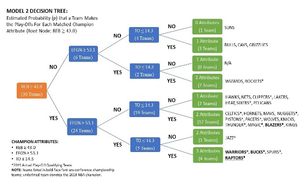 33.6 percent chance to make the playoffs if they possessed all three attributes as the previous NBA champions. Teams with two attributes have a 30.2 percent chance, teams with one attribute have a 2.8 percent chance, and those who possess none of the attributes have no chance at making the playoffs. Overall, although the first decision tree model did an alright job at sorting out all 30 teams, the estimated probability compared to the actual results of the 2018-2019 were not as accurate as it could be.